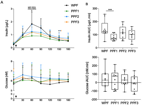 Overall, there were little differences in postprandial glucose and insulin kinetics in response to the different test meals. However, interestingly, the insulin iAUC is higher after WPF than after PPF1 ingestion (p < 0.001). Glycemia curves and iAUC were not significantly different between WPF and PPF product ingestion (p > 0.05) and were overall flat, as presented in Figure 5. This is not surprising given the equally and low carbohydrate content in all meals (15.2 g).