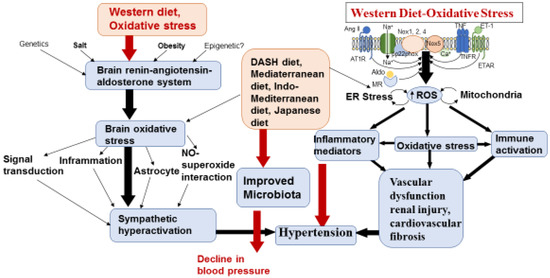 An unhealthy diet, in particular, high salt, sugar and saturated fat intake, without an optimal vegetable and fruit intake, physical inactivity, alcoholism, tobacco, sleep and emotional disorders are major risk factors for hypertension. Apart from an excess of sodium in the diet, unhealthy western type diets appear to have independent adverse effects on vascular function by causing oxidative stress and inflammation leading to an impaired vascular function and an increase in BPs. Oxidative stress due to glucotoxicity and lipotoxicity is characterized by excessive production of ROS and an altered oxidation-reduction (redox) state, leading to a marked increase in inflammation in the brain, gut and vessels. The DASH diet, established for the prevention and treatment of hypertension, does not appear to be superior to the Mediterranean diet in reducing BPs and CVDs. The Mediterranean type of diet and Indo-Mediterranean diet, apart from providing potassium and calcium, may also have increased additional beneficial effects due to greater fiber and flavonoids on gut microbiota, which is known to regulate BPs. Since the Indo-Mediterranean diet and Mediterranean diet contain more flavonoids and fiber, and the Japanese diet is rich in fish omega-3 fatty acids and fish peptides, it poses the possibility that these diets are superior to the DASH diet in reducing BPs, as well as CVDs and all-cause mortality. Larger randomized, controlled trials and cohort studies would be necessary to confirm our views.