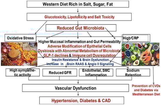 Apart from western diet-induced oxidative stress, increased salt intake in conjunction with other risk factors of hypertension can also cause an increase in brain RAAS, which increases oxidative stress with increased angiotensin II signaling in the neuronal cells, in the brain. There is increased activity of the sympathetic nervous system leading to elevation in BPs. Intervention with an Indo-Mediterranean diet decreases oxidative stress with a decline in sympathetic activity with a reduction in BPs, as given in Figure 3.