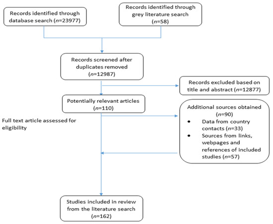 In total, 162 peer-reviewed articles, grey literature documents, websites and references from country contacts were identified via the literature search. Of these, 72 were peer-reviewed relevant articles, and 90 were additional documents/sources obtained from country contacts (through the questionnaires), webpages, links, and references from within the included articles (Figure 1).