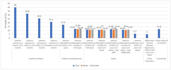 Figure 2 and Figure 3 illustrate TS intakes as % EI, based on national and regional studies (i.e., specific regions within a country), respectively. As shown in Figure 2, national surveys conducted in Lebanon (and which were based on dietary assessment approaches) showed that TS intake ranged between 17.4% EI and 40% EI among underfive children, the highest being in 0–6 month old children [57]. In Lebanese children and adolescents, the intake of TS was estimated at 12% EI [39], while in adults, it ranged between 10.5 and 12% EI [39,41]. The study in Afghanistan reported a per capita estimate of 5% EI based on a 7-day food consumption recall [44], while the household budget survey conducted in Jordan reported an estimate of 11.8% EI [46] (Figure 2). As for regional studies (Figure 3), TS intake levels among adults were estimated at 13.5% EI and 14.7% EI in Palestine (West Bank) and Lebanon (Beirut) [55,61], respectively, and rural women in Iran (7.6%) [54], while being slightly higher among urban women in Egypt (16% EI) [53] (Figure 3). Among the few countries that have evaluated TS intake among adolescents, Jordan (Amman) reported the highest levels (42–48% EI) [60], while Libya (Benghazi) reported the lowest (20.4% EI) [52]. TS intakes were also estimated among underfive children in the United Arab Emirates (UAE) (the Emirates of Abu Dhabi, Dubai and Sharjah), ranging between 20% and 33.5%, the highest estimate being observed in 0–6 months old infants [59].