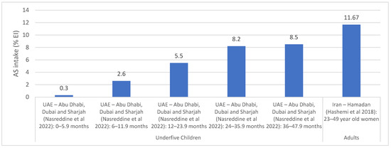 AS intake estimates (% EI) based on regional studies in countries of the EMR. Abbreviations: AS: added sugars; EI: energy intake; EMR: Eastern Mediterranean Region; UAE: United Arab Emirates. References: For underfive children: UAE (dietary assessment): Nasreddine et al., 2022 [59]. For adults: Iran (dietary assessment): Hashemi et al., 2018 [64].