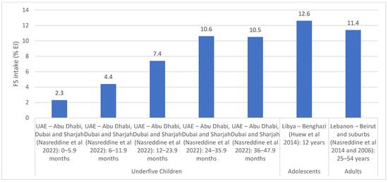 FS intake estimates (% EI) based on regional studies in countries of the EMR. Abbreviations: EI: energy intake; EMR: Eastern Mediterranean Region; FS: free sugars; UAE: United Arab Emirates. References: For underfive children: UAE (dietary assessment): Nasreddine et al., 2022 [59]. For adolescents: Libya (dietary assessment): Huew et al., 2014 [52]. For adults: Lebanon (dietary assessment): Nasreddine et al., 2014 and Nasreddine et al., 2006 [66,67].