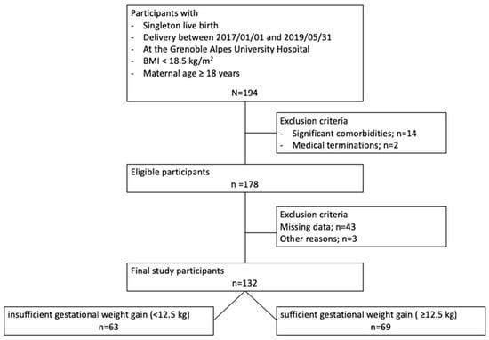 Participants meeting inclusion criteria (n = 194) were screened. A total of 132 participants with a median age of 28 ± 8 years were included in the insufficient (n = 63) and sufficient (n = 69) gestational weight gain groups (Figure 1).