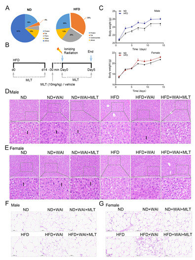 MLT reduces the damage of iWAT in mice induced by WAI. Mice were fed an HFD for 2 weeks, then given whole abdominal irradiation. MLT was injected intraperitoneally 30 min before WAI. Control mice received sham irradiation (B). (A) The fat content of a normal diet (ND) was 4%, whereas that of an HFD was 35%. (C) Body weights of ND-fed and HFD-fed mice. Representative H&E staining of hepatic lipids from male (D) and female (E) mice (20 × magnification); the black arrows indicate the perisinusoidal space. Representative H&E staining of iWAT from male (F) and female (G) mice (20 × magnification). (WAI, whole abdominal irradiation; HFD, high-fat diet; MLT, melatonin; H&E, hematoxylin and eosin).