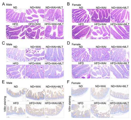 The main function of goblet cells is to synthesize and secrete mucoproteins (Muc), which form a mucosal barrier to protect intestinal epithelial cells (IECs) [21]. PAS staining showed that the number of goblet cells in the HFD and ND groups was similar in male mice, indicating that short-term HFD had no obvious effect on male mice, whereas the number of goblet cells in the HFD and ND groups in female mice was statistically different (Figure S2A,B). Irradiation reduced the number of goblet cells in mice (Figure 2C,D). Compared with the male HFD + WAI group, the number of goblet cells in the female HFD + WAI group was expressively reduced, indicating that female mice fed a short-term HFD were less tolerant to WAI-induced intestinal injury. However, MLT treatment improved the number of goblet cells.