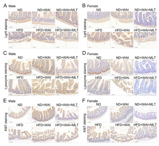 IECs have the ability to continuously self-renew [22]. After destruction by external factors, epithelial cells can rapidly regenerate and restore homeostasis in intestinal cells. As a marker of intestinal stem cells, Lgr5 plays a crucial role in intestinal regeneration after radiation injury [23]. Paneth cells are IECs that secrete antibacterial proteins such as lysozyme [24]. Paneth cells participate in the maintenance of intestinal environmental homeostasis by killing intestinal microorganisms. Ki67 is a marker for regenerating epithelial cells and can be identified as proliferating cells in the small intestine [25]. Therefore, we examined the effect of MLT on WAI-induced intestinal injury using IHC staining. For both male and female mice, the results showed that the number of Lgr5+ ISCs and lysozyme+ Paneth cells in the HFD and ND groups were similar, suggesting that HFD may have no obvious effect on the expression of these cells (Figure 3A–D and Figure S3A–D). However, the number of Ki67+ cells in the HFD group of female mice was lower than that in the ND group (Figure S3F). Compared with the sham irradiation group, the number of Lgr5+ ISCs, lysozyme+ Paneth cells, and Ki67+ cells was significantly reduced in the irradiated group five days after WAI, although these changes were reversed after MLT treatment (Figure 3A–F and Figure S3A–F). These results illustrate that MLT can improve the regenerative capacity of ISCs and sustain homeostasis in the intestine by enhancing the proliferation and differentiation of crypt cells.