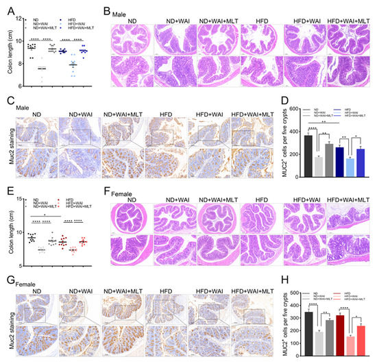 To further explore the severity of intestinal injury caused by WAI in mice, we collected the colons of the mice and measured their length after irradiation. As shown in Figure S4, the colons of mice were shortened after WAI. The colon length of MLT-treated mice was similar to that of sham-irradiated mice. Notably, an HFD shortened the colon length in female mice but not in male mice (Figure 4A,E). Compared to the ND group, H&E staining showed leukocyte infiltration in the submucosa of the colon in the HFD group, and the crypt depth decreased (Figure 4B,F). After WAI, the crypt structure was partially missing, the crypt became shallow, and the glands were misaligned. Thus, MLT treatment may alleviate colonic injury.