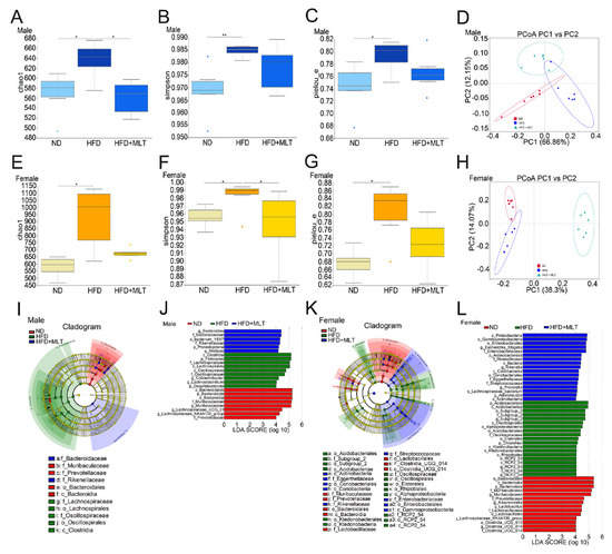 Studies have shown that an HFD can cause dysregulation of the gut microbiota [27,28]. We used 16S rRNA gene sequencing to study the gut microbiota of HFD-fed mice, with or without MLT treatment. High-throughput sequencing analysis showed that an HFD increased α-diversity of intestinal microbes in both male and female mice. The Chao1 index confirmed that the abundance of microbiota in the HFD-fed mice was significantly higher than that in the ND group (Figure 5A,B). However, MLT treatment restored the microbiota abundance to the approximate levels seen in the ND group. The observed operational taxonomic units (OTUs) and dominance indices also confirmed these results (Figure S5A,B,E,F). The Simpson index indicated that the microbiota diversity of the HFD-fed mice increased (Figure 5B,F). The same phenomenon was observed using the Shannon index (Figure S5C,G). Pielou’s evenness index showed that the species in the HFD group were uniform, while MLT treatment reduced the diversity of microbiota and improved species evenness (Figure 5C,G). Principal coordinate analysis (PCoA) and non-metric multidimensional scaling (NMDS) showed that the composition of the intestinal microbiota was clearly separated after HFD and MLT treatment in male and female mice, suggesting that HFD and MLT shaped the intestinal microbiota profile. To distinguish the differentially abundant OTUs, we used linear discriminant analysis (LDA) and effect size (LEfSe) analyses to show the differences in microbiota abundance among the three groups of mice. Compared with the ND group, Clostridia and Firmicutes were more abundant in the HFD group of male mice, while Acidobacteriales were more abundant in the HFD group of female mice (Figure 5I–L). After MLT treatment, the abundance of Bacteroides and Proteobacteria in male and female mice, respectively, increased. These data demonstrate that MLT may restore the intestinal microbiota structure altered by an HFD.