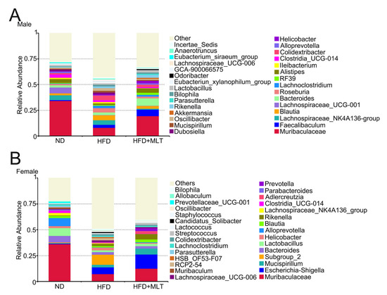 At the genus level, community analysis among the three groups showed that the genus with the highest relative abundance was Muribaculaceae. In male mice, HFD treatment increased the relative abundance of Blautia (Figure 6A). HFD treatment diminished the relative abundance of Lactobacillus in female mice (Figure 6B). MLT treatment restored the abundance of the corresponding microbiota to levels close to those present in the ND group.