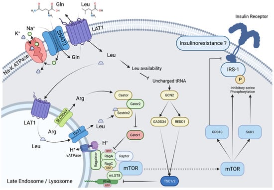 As already mentioned, leucine, through its interaction with Sestrin 2, promotes the activation of mTORC1, leading in particular to the activating phosphorylation of p70SK1 and inhibiting one of 4E-BP1, thus participating in the postprandial induction of protein synthesis. In essence, this system involves other regulatory elements or systems, for example, the availability of different substrates (e.g., via the level of amino acylation of tRNAs and General control nonderepressible 2 (GCN2)) or the level of restoration of protein pool. In terms of insulin signaling, through mTORC1 and p70S6K1, leucine induces a feedback inhibition via serine phosphorylation of IRS1. However, whether this feedback control causes insulin resistance is controversial. Alternatively, it has been proposed that it is not the BCAAs themselves but their metabolites that impair insulin sensitivity.