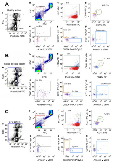Gating strategy for EV identification. EV identification and sub-typing in (A) healthy subjects, (B) Celiac disease patients and (C) celiac disease patients under a gluten-free diet (GFD patient). (a) Phalloidin-negative events were firstly gated and (b) analyzed for their SSC-H/FSC-H parameters. The scatter area identified on the basis of MegaMix Plus beads (broadly 0.1–1 µm) was selected and named platelet (PLT)-free area. (c) Events were then analyzed on a Phalloidin-H/LCD-H dot-plot and phalloidin– LCD+ vesicles were gated and identified as EVs. EVs were finally sub-typed: (d) platelet-derived EVs (PLT-EVs) were gated on the basis of their combined positivity to CD31 and CD41a. The gate “NOT-PLT-EVs” was obtained and, in such a population, (e) Leukocyte-derived EVs (Leu-EVs) were identified as CD45+ events. By creating a logical gate “Not-Leu-EVs”, (f) endothelial-derived EVs (CD31+, Endo-EVs) and epithelial-EVs (CD326/EpCAM+, Epi-EVs) were also gated. (g) Annexin V positivity was also assessed on an Annexin V-H/CD31-H dot-plot, and the gate was then applied to any identified EV subset. Data are representative of all peripheral blood samples analyzed by flow cytometry.