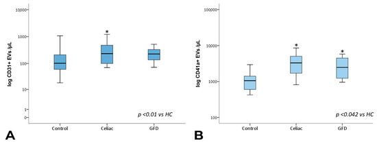 Total CD31+ and CD41a+ EV counts. Box plots represent CD31+ (A) and CD41a+ (B) EV concentrations (EVs per µL, log-transformed) in peripheral blood obtained from controls, celiac, and GFD patients. The horizontal line represents the median value. The asterisk (*) identifies statistically significant differences.
