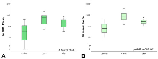 Total CD45+ and EpCAM+ EV counts. Box plots represent CD45+ (A) and EpCAM+ (B) EV concentrations (EVs per µL, log-transformed) in peripheral blood obtained from controls, celiac, and GFD patients. The horizontal line represents the median value. The asterisk (*) identifies statistically significant differences.