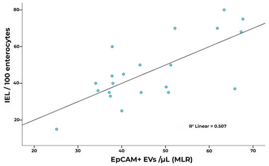 Correlation of IEL concentration and R model-predicted EpCAM+ counts (unstandardized predicted value) in CD. In a multiple linear regression model including total, EpCAM+, and CD31+, CD45+ and CD41a+ counts, EpCAM+ EVs represent a statistically significant predictor (IEL: intraepithelial leukocytes).