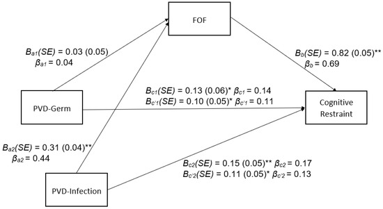 PVD Subscales and Cognitive Restraint Mediated by FOF. Process Model—4 path estimates from testing the indirect effect of perceived germ aversion (PVD-Germ) and perceived infectability (PVD-Infection) on cognitive restraint through fear of fat (FOF). Standardized coefficients (β), unstandardized coefficients (B), and standard errors (SE) are presented (* p < 0.05, ** p < 0.01).