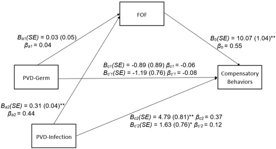 PVD Subscales and Compensatory Behaviors Mediated by FOF. Process Model—4 path estimates from testing the indirect effect of perceived germ aversion (PVD-Germ) and perceived infectability (PVD-Infection) on compensatory behaviors through fear of fat (FOF). Standardized coefficients (β), unstandardized coefficients (B) and standard errors (SE) are presented (* p < 0.05, ** p < 0.01).