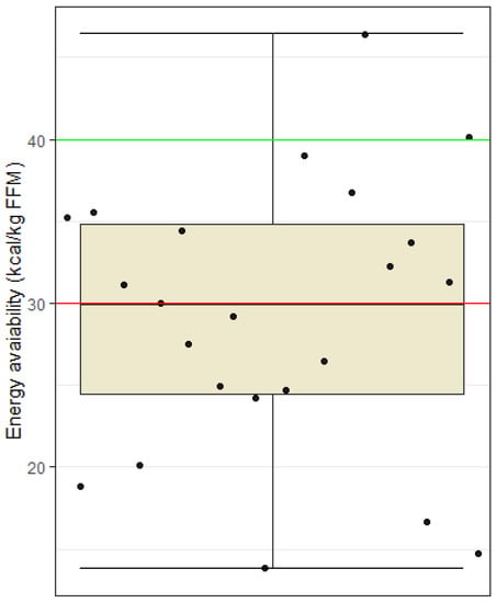 Values below 30 kcal/kg FFM as clinically low energy availability, values between 30 and 40 kcal/kg FFM as subclinical low energy availability, and optimal or high energy availability as equal to or exceeding 40 kcal /kg FFM [19,20]. For women, this limit was set slightly higher, above 45 kcal/kg FFM [19]. Using a one-sided t-test, we found that the sample average of energy availability is statistically significantly lower than 40 kcal/kg FFM (t = −6.23, df = 22, p < 0.001). The average energy availability of the subjects was 29 kcal/kg FFM, which corresponds to the criteria of clinical energy availability (Figure 1).