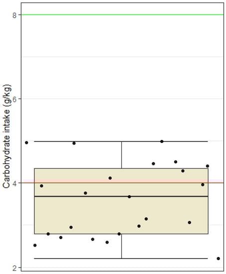 Carbohydrate intake among football players. Dots represent individual participants (n = 23). The red line indicates the lower limit of the recommended intake for football players in the preseason period (4 g/kg BW), and the green line indicates the upper limit of the recommendation (8 g/kg BW).