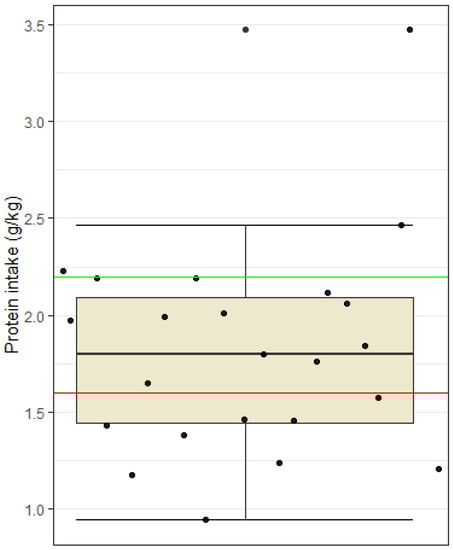 Protein intake among football players. Dots represent individual participants (n = 23). The red line indicates the lower limit of the recommended intake (1.6 g/kg BW) and the green line the upper limit of the recommendations (2.2 g/kg BW).