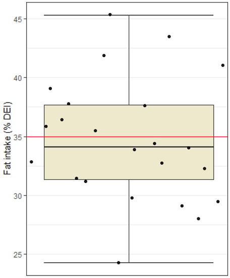 Fat intake among football players. Dots represent individual participants (n = 23). Red line indicates upper limit of recommended intake (35% of daily energy intake).