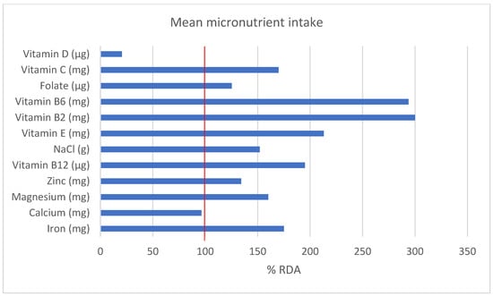 Intake of micronutrients among football players (n = 23), presented as a percentage of the recommended daily intake (RDA).