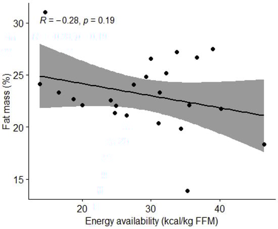 Correlation between energy availability and body fat percentage in football players. Dots represent individual participants (n = 23). Grey shaded area indicates 95% confidence interval (CI).