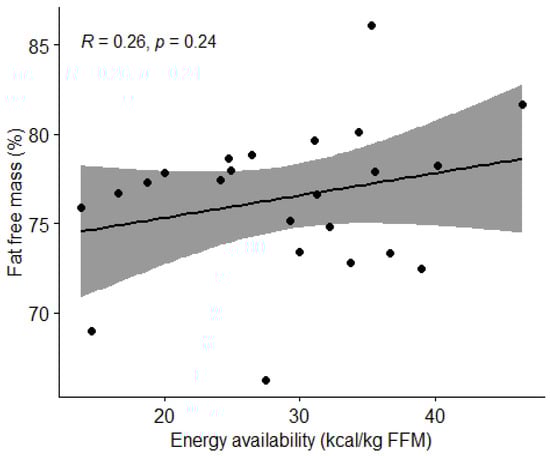 Correlation between energy availability and percentage of lean body mass in football players. Dots represent individual participants (n = 23). Grey shaded area indicates 95% CI.