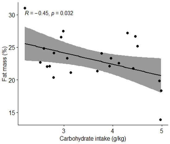 Correlation between carbohydrate intake and body fat percentage in football players. Dots represent individual participants (n = 23). Grey shaded area indicates 95% CI.
