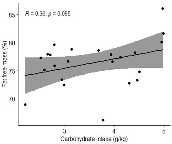Correlation between carbohydrate intake and percentage of lean body mass in football players. Dots represent individual participants (n = 23). Grey shaded area indicates 95% CI.
