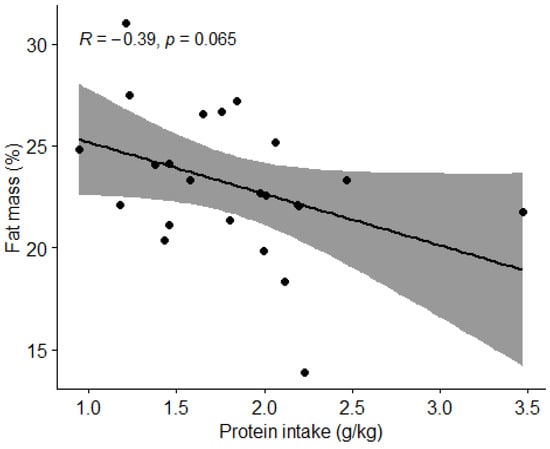 Correlation between protein intake and body fat percentage in football players. Dots represent individual participants (n = 23). Grey shaded area indicates 95% CI.