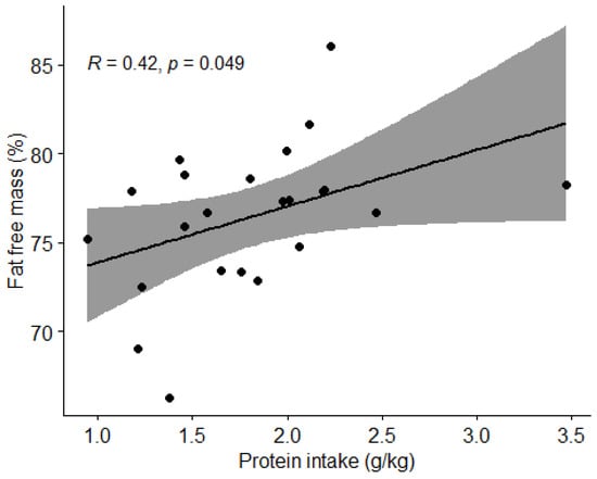 Correlation between protein intake and percentage of lean body mass in football players. Dots represent individual participants (n = 23). Grey shaded area indicates 95% CI.