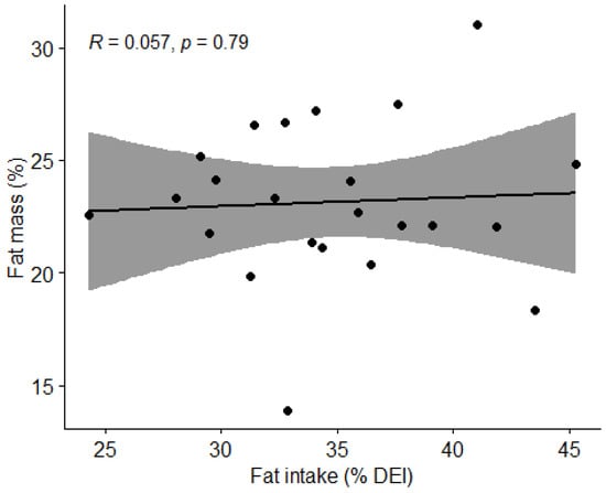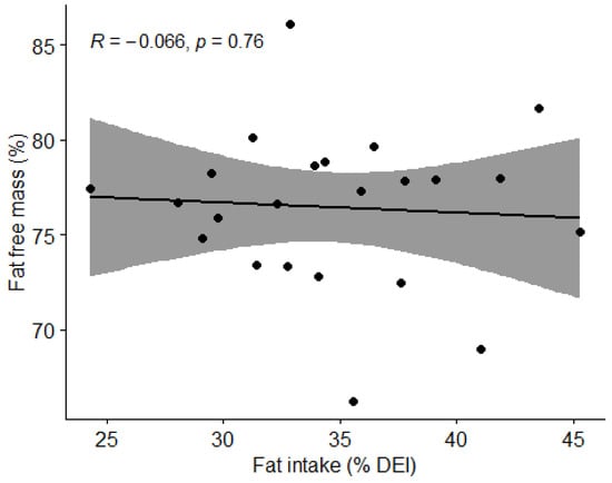 We investigated the influence of the percentage of energy intake from fat on fat and lean BM. Using Pearson’s correlation coefficient (r) showed no correlation (p > 0.05) between fat intake and fat or lean BM (Figure 12 and Figure 13).