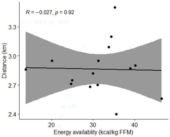 Using Pearson’s correlation coefficient (r), we found no correlation (p > 0.05) between energy availability and the distance covered in the Cooper test (Figure 14).