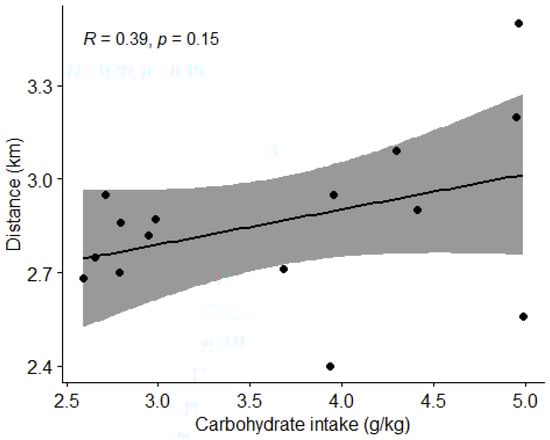 Correlation between carbohydrate intake and distance covered by subjects in the Cooper test. Dots represent individual participants (n = 15). Grey shaded area indicates 95% CI.