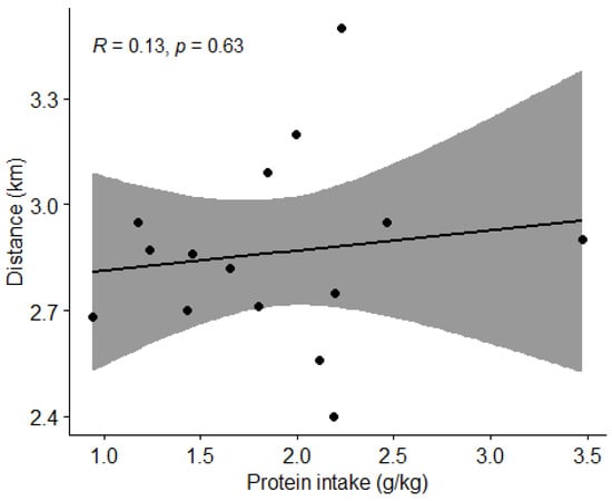 Correlation between protein intake and distance covered by subjects in the Cooper test. Grey shaded area indicates 95% CI. Dots represent individual participants (n = 15).