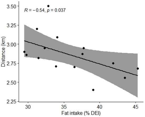 Correlation between the percentage of fat in the diet and distance covered by subjects in the Cooper test. Dots represent individual participants (n = 15). Grey shaded area indicates 95% CI.