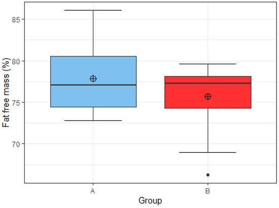 Distribution of percentage of lean body mass by group A (n = 8) and group B (n = 15). Group A: appropriate intake of protein and carbohydrate. Group B: inappropriate intake of protein or carbohydrate.