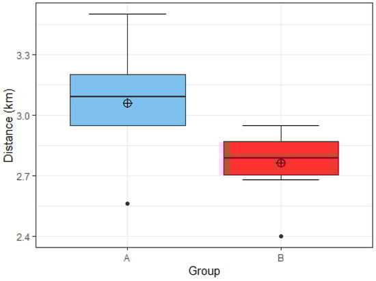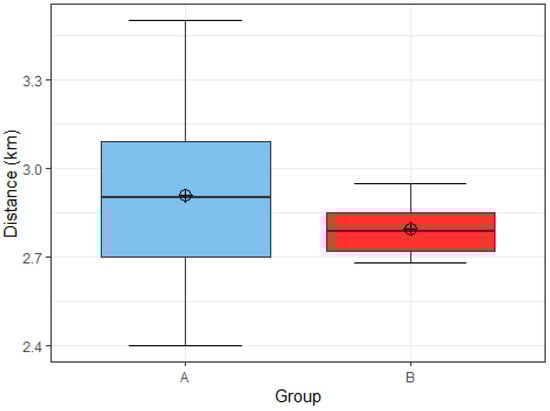 15 football players took part in the Cooper performance test. There were 5 football players from group A, and they covered an average distance of 3.06 km in 12 min, with a minimum distance of 2.56 km and a maximum distance of 3.5 km. The average distance covered in group B was 300 m shorter (2.76 km), with a minimum distance of 2.4 km and a maximum distance of 2.95 km (Figure 19). Using Welch’s t-test we rejected hypothesis 2, as we found no statistically significant differences between the two groups in the distance covered in the Cooper test (t = 1.8255, df = 4.8542, p = 0.1293).