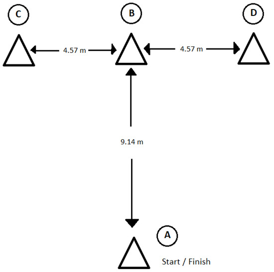 The running time was assessed with 5 m and 10 m straight sprints, and a simple running agility test (modified t-test) was used to determine the speed with direction changes. The modified t-test (Figure 1) was performed based on the protocol proposed by Pauole et al. [34]. The modified t-test started with running forward to cone B, the base of which had to be touched with the right hand. Then the players facing the same direction moved left towards cone C, which had to be touched with the left hand. Next, the players shuffled right to cone D and touched it with their right hand. Then they went back to cone B andtouching it again. Finally, they ran backward to the starting line to complete the test. The test was repeated when the player did not touch the base of the cone with his/her hand, crossed his/her feet while shuffling sideways, or failed to face forward throughout. The running tests were measured by a set of photocells (Witty, Microgate, Bolzano, Italy), which was used to record the time of running tests in other authors’ research [35,36]. The tests were started from a standing position with feet placed 0.3 m before the starting line with the first photocells gate. The players were instructed to run as quickly as possible from a standing position, always starting with the same preferred leg [37]. The players made 2 trials of each test with 2 min rest between trials, and the best time of two attempts was used for statistical analysis. The accuracy of the measurement was 0.01 s.