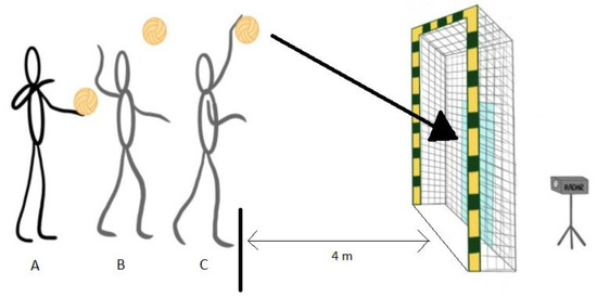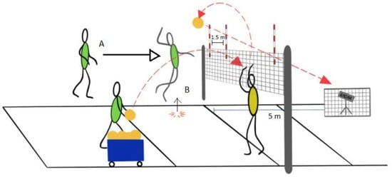 The protocol of these exercises is based on a special testing protocol for monitoring spike and serve speed in volleyball published by Palao and Valades [38]. In the maximal standing spike test (Figure 2), the players were instructed to hit the ball as hard as possible by self-tossing without jumping. They were supposed to hit the designated zone (1.5 m × 1.5 m), which would be 4 m from the measuring point. The ball velocity of attack and volleyball service tests were performed on a standard volleyball court (9 m × 18 m) and at a constant net height of 2.24 m for women and 2.43 m for men. In the attack test (Figure 3), the players were instructed to hit the ball over the net with maximum force toward the designated zone linearly. The same setter set the ball to ensure standardization across each trial. The players used their natural attacking technique in their specific play zone during the attack. In the volleyball service test (Figure 4), the players hit the ball over the net with maximum strength towardsthe opponent’s court. They performed this test using their standard serving technique with a self-toss. In each test, the players made 3 attempts with a 30-s rest period between repetitions [38], and the best result of the three trials was used for further analysis. The ball velocity was measured with a radar gun (Velocity Speed Gun, Bushnell; Overland Park, KS, USA) that has been used in another publication [39]. A standard ball (Molten V5M5000) was used for tests, which players use during training and matches.