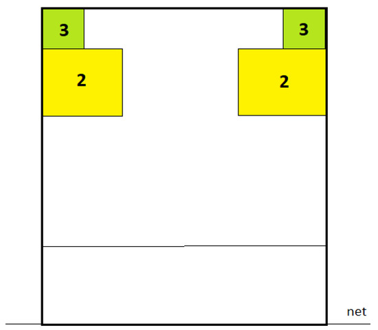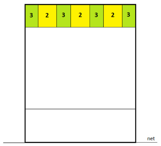 Volleyball skills were assessed in terms of the accuracy of the attack and the service. These tests were performed on a standard volleyball court (9 m × 18 m) and at a constant net height of 2.24 m for women and 2.43 m for men. A modified test designed to standardize skill assessment for junior volleyball players was used to assess the accuracy of the attack [40]. The court has been divided into segments with a point value assigned to them (Figure 5). If the players hit the green zone (1 m × 1 m), they received 3 points; if they hit the yellow zone (2 m × 2 m), they got 2 points. The 1 point was awarded for hitting the ball in the court but outside the designated zones, while an error in the attack (ball in out or in the net) meant 0 points in a given attempt. The same setter set the ball to ensure standardization across each trial. The players used their natural attacking technique in their specific play zone during the attack. Instead, the accuracy of the volleyball service was assessed using the test proposed by Lidor et al. [41]. Scoring was awarded the same way as in the attack skills test, but the zones’ sizes differed (Figure 6). The green zone was a dimension of 1 m × 0.75 m (for 3 points), and the yellow area was 1 m × 2 m (for 2 points). The players performed this test using their standard serving technique with a self-toss. Points for the above skills were allocated by two independent observers, by the previously designated target areas, and there were no differences between the results reported by the arbiters. The competitors made 10 attempts in each test, and the sum of these ten trials was the result indicating the accuracy of the competitor. A standard ball (Molten V5M5000) was used for these tests, which players use during training and matches.
