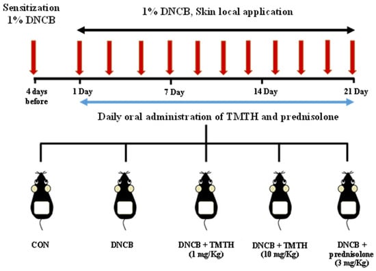 After two weeks of acclimatization, C57BL/6 mice were randomly allocated into five treatment groups (n = 5 per group): control group (CON), DNCB-treated group, TMTH (1 and 10 mg/kg, oral administration) with DNCB-treated group, and prednisolone (Youhanyanghaeng, Seoul, South Korea; 3 mg/kg) with DNCB-treated group (positive group). Dorsal hair was completely removed (approximately 4 × 3 cm) using an electric clipper one day before sensitization with DNCB. Subsequently, 200 μL of 1% DNCB was applied to the dorsal skin four days before oral administration and on day 1 for AD sensitization. An acetone: olive oil mixture (3:1, v/v) was used to prepare 1% DNCB. AD-like skin lesions were induced by applying 200 μL of 1% DNCB solution to the dorsal skin at two-day intervals for three weeks. Upon sensitization, sterile distilled water preparations of TMTH and prednisolone were administered orally (100 μL) daily for three weeks. Sterile distilled water (100 μL) was orally administered to the DNCB group mice. After three weeks of treatment, the mice were euthanized, and the respective samples were collected. The experimental design used in this study is summarized in Figure 1.