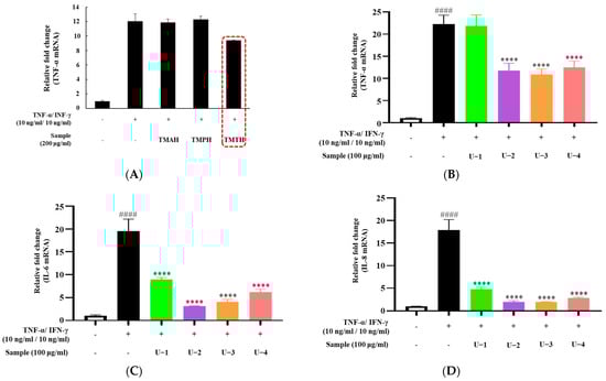 Effects of different protein hydrolysates of Tenebrio molitor larvae and different molecular fractions of T. molitor trypsin hydrolysate (TMTH) on the expression levels of cytokines in HaCaT cells. The cells were pretreated with three protein hydrolysates of T. molitor larvae: alkaline protease (TMAH), neutral protease (TMPH), and trypsin (TMTH) hydrolysates, and four molecular fractions of TMTH: U-1 (<1 kDa), U-2 (1–10 kDa), U-3 (10–100 kDa), and U-4 (>100 kDa) at 200 and 100 µg/mL concentrations. Subsequently, cells were induced with interferon (IFN)-γ (10 ng/mL)/tumor necrosis factor (TNF)-α (10 ng/mL) for 6 h. (A) TNF-α mRNA expression of TMAH-, TMPH-, and TMTH-treated HaCaT cells. (B) TNF-α, (C) interleukin (IL)-6, and (D) IL-8 mRNA expression of U-1, U-2, U-3, and U-4 treated HaCaT cells. Each bar represents the mean of three replicates. Data are expressed as the mean ± standard deviation (SD) of three replicates. #### p < 0.0001 vs. untreated control; **** p < 0.0001 vs. TNF-α/IFN-γ group. IL: interleukin; TNF: tumor necrosis factor; IFN: interferon.