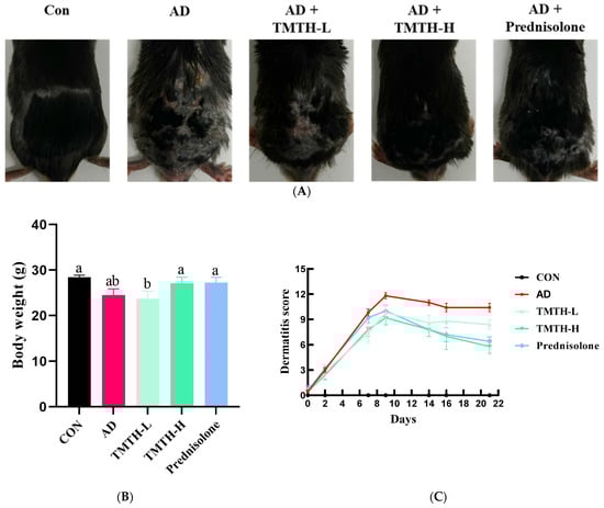 Effects of Tenebrio molitor trypsin hydrolysate (TMTH) on DNCB-induced AD-like lesions in the skin of C57BL/6 mice. (A) Clinical features of the control group, AD group, and DNCB-induced mice treated with TMTH and prednisolone group after three weeks. (B) Average body weight of control group, AD group, and DNCB-induced mice treated with TMTH and prednisolone group after three weeks. (C) Dermatitis score of the control group, AD group, and DNCB-induced mice treated with TMTH and prednisolone group after three weeks. The significant values are indicated based on the Tukey’s multiple comparisons test (p < 0.05) and results are expressed as the mean ± standard deviation (SD). Different letters indicate statistically significant differences (p ≤ 0.05) among treatments. CON: control group; AD: DNCB-treated group; TMTH-L: mice challenged with 1% 2,4-dinitrochlorobenzene (DNCB).