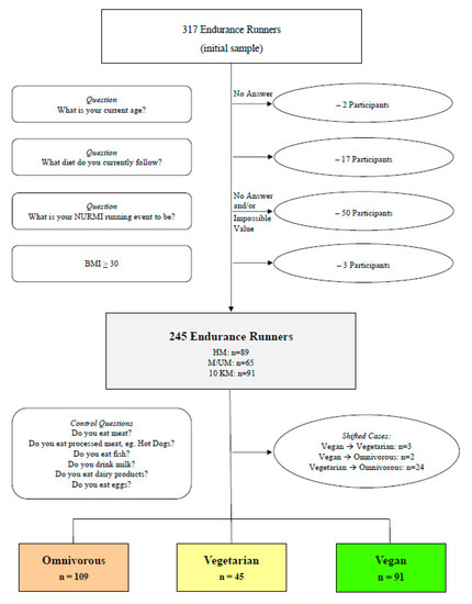 Therefore, based on the inconclusive evidence on the comparison of endurance performance among recreational long-distance runners following omnivorous, vegetarian, and vegan diets [18,32,33,35,36,37], this study is the first to examine different general diet types among runners regarding long-distance athletic performance in recreational half-marathon (HM), marathon (M), and ultra-marathon (UM) races while considering a comprehensive list of training behaviors. The present investigation primarily aimed to assess performance while considering a thorough list of training and experience confounders secondarily. It was hypothesized that there is no difference in best HM and M time performances between recreational long-distance athletes based on adhering to general omnivorous, vegetarian, or vegan diets.