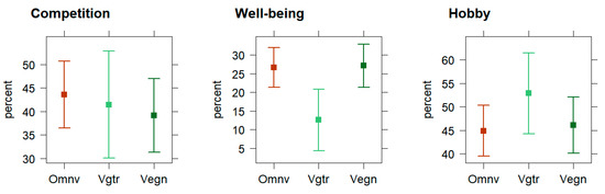 Effect plots display 95% CI average for training/running/racing motivations across dietary subgroups (n = 231): competition, well-being, and hobby. Note. 95% CIs were computed using the multivariate regression analyses (Wald approximation).