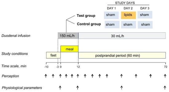 Aversive conditioning (2nd study day in aversive conditioning group only) was produced by infusion of lipids (300 mg/mL purified soybean oil; Intralipid, Fresenius Kabi, Barcelona, Spain) into the duodenum via the nasoduodenal catheter. Lipids were continuously infused starting 3 min before, during and 60 min after ingestion of the probe meal (total infusion time = 75 min) using an infusion pump (Compat Ella Push, Nestle Health Science, Barcelona, Spain) at a rate of 150 mL/h during the first 15 min (3 min pre-ingestion period and 12 min ingestion period) and at 30 mL/h during the 60 min postprandial period (Figure 1). On the rest of the study days (i.e., 1st and 3rd days in the conditioning group, and the three study days in the control group), a sham infusion was performed following the same procedure, but diverting the lipid flow from the infusion line via a 3-way stopcock to a reservoir. Lipid and sham infusions were performed single-blind, i.e., without the participants knowing the type of infusion.