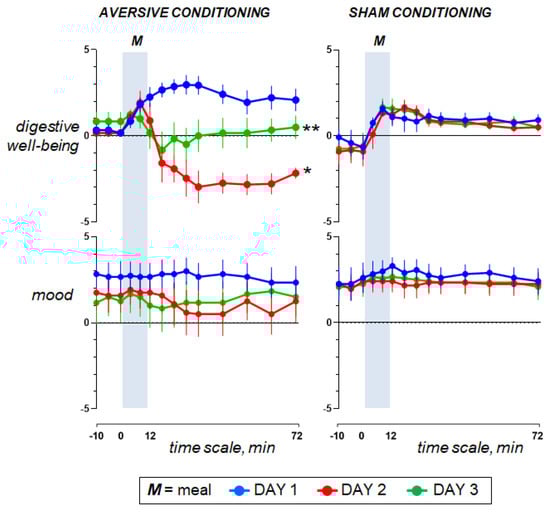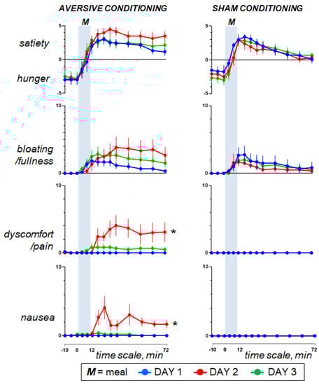 The digestive process that follows meal ingestion is associated with a postprandial experience that involves homeostatic sensations (satiety, fullness) with a hedonic dimension (digestive well-being, mood) []. The postprandial experience depends on the characteristics of the meal (organoleptic, amount and composition) and of the individual, including digestive function, intestinal sensitivity and cognitive/emotive factors, which may be influenced by a variety of conditions []. Pavlovian conditioning, also known as classical conditioning, refers to the behavioural technique of pairing a physiological stimulus with a neutral stimulus; repeated exposure to the pairing induces a learning process, by which the biologic response to the physiological stimulus is triggered by the neutral stimulus alone. Pavlovian conditioning has been shown to magnify the expectation of aversive sensations and has been postulated as a mechanism of hypervigilance and visceral hypersensitivity [,,,]. Associative learning, understood as the learned association between two unrelated stimuli, has also been also shown to induce taste aversion and avoidance: e.g., a pleasant taste becomes disagreeable by previous association with an unpleasant experience [].