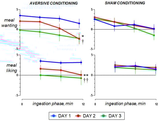 Reward value during meal ingestion. The comfort meal was served in 3 portions; meal wanting was measured before each serving and at the end of ingestion; meal liking was measured after each serving. On day 2, concomitant duodenal lipid infusion impaired the ingestive response (effect measured as the change in the area under the curve on day 2 minus day 1 vs. sham infusion; * p = 0.041 for meal wanting; ** p = 0.013 for meal liking). Data on Day 3 show that aversive conditioning in the test group (previous exposure to the aversive stimulus) significantly reduced the valence of the comfort meal (effect measured as the change in the area under the curve on day 3 minus day 1 vs. sham conditioning; † p = 0.023 for meal wanting; †† p = 0.030 for meal liking). Values represent mean ± SE.